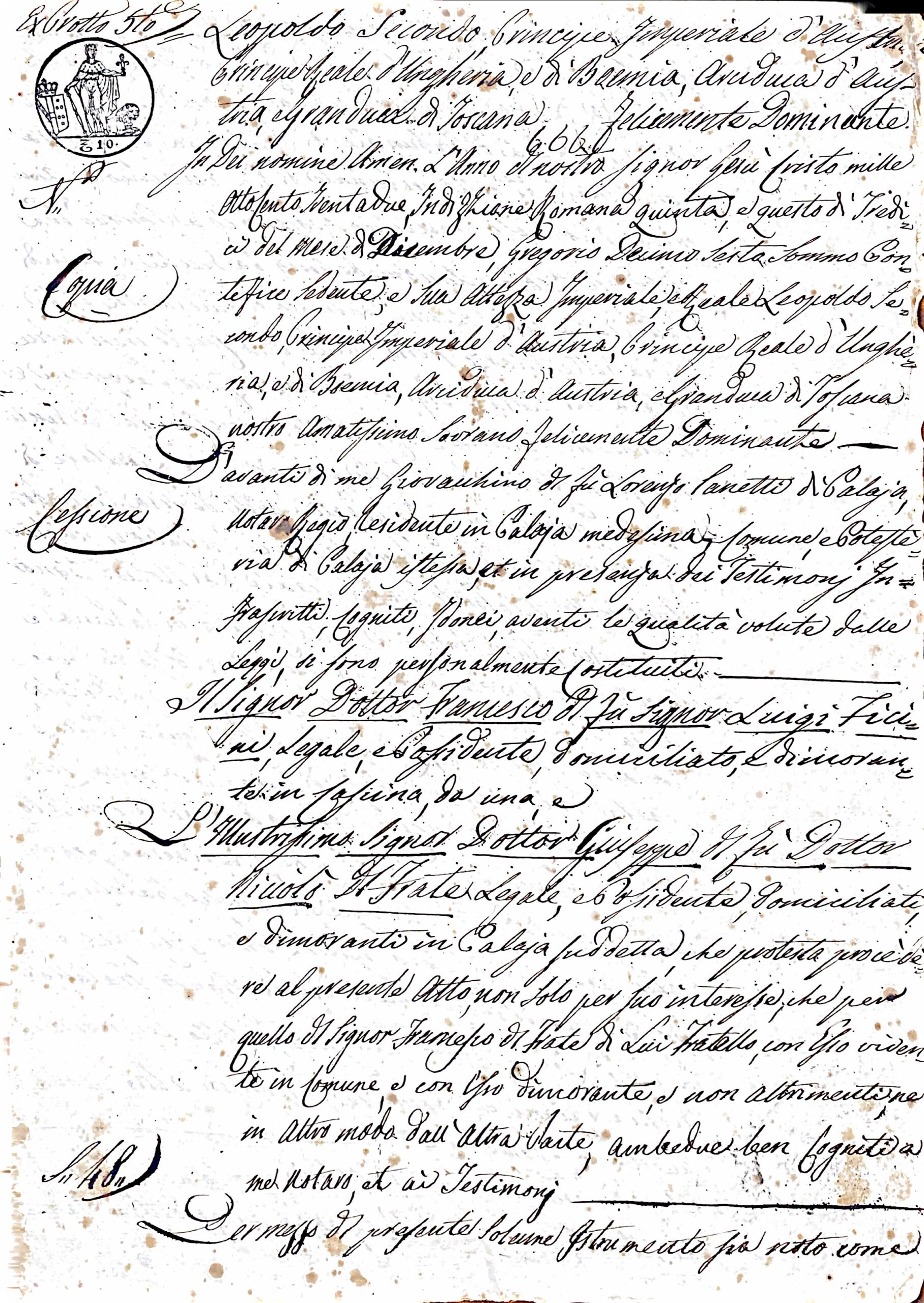 Nel cuore della Toscana della Restaurazione, tra le colline di Palaia e le campagne di Cascina, un fascicolo d’archivio ci svela intricate vicende patrimoniali tra due figure di spicco della comunità locale: il Dottor Francesco Ficini e l’Illustrissimo Dottor Giuseppe Di Frate. Datato 13 dicembre 1832, questo documento getta luce su un momento storico in cui la legge e gli affari di famiglia si intrecciavano strettamente.
