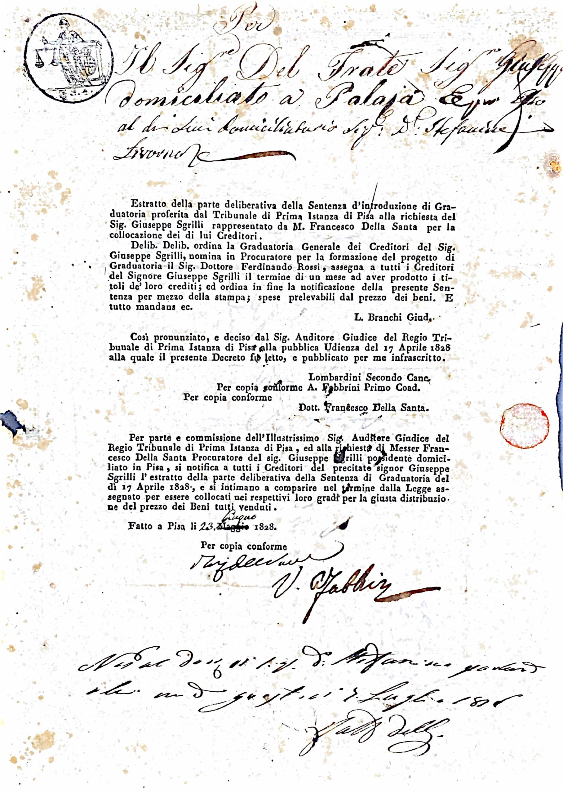 Il cuore del fascicolo è rappresentato dalla “Sentenza d’introduzione di Graduatoria” emessa dal Regio Tribunale di Prima Istanza di Pisa il 17 aprile 1828 e pubblicata il 23 maggio dello stesso anno. Questa sentenza segna un momento cruciale nella liquidazione dei debiti di Sgrilli, avviando un processo complesso e meticoloso per stabilire l’ordine di priorità dei creditori. Il documento offre una finestra privilegiata sulle dinamiche del sistema legale granducale e sulle tutele, seppur limitate, previste per i creditori.
