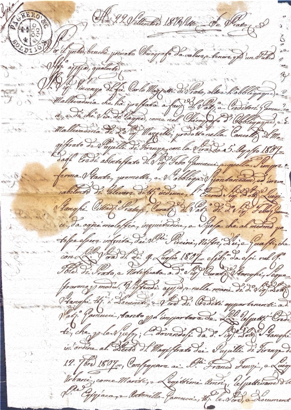 Un elemento di particolare interesse è un chirografo datato 22 settembre 1807, redatto a Prato. In questo documento, Vincenzo Mazzetti assume un’obbligazione e una mallevadoria a favore del dottor Luigi Stanghi, curatore del patrimonio di Febo Gamucci. Il Mazzetti si impegna a tutelare lo Stanghi da eventuali azioni legali e sequestri promossi da un certo Picci…