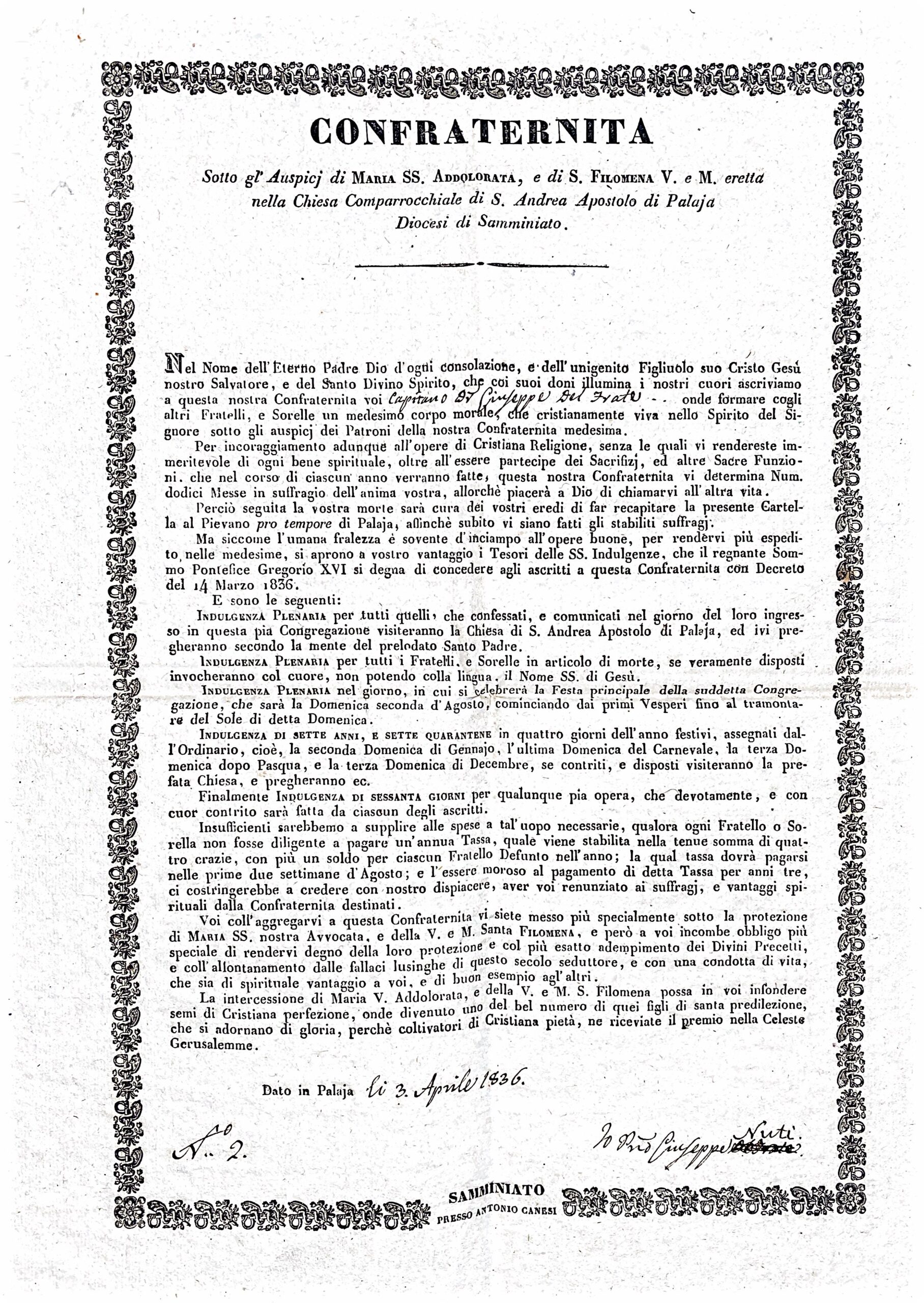 Un documento d’archivio recentemente riscoperto getta luce sulla vita religiosa e sociale di Palaia, un piccolo centro nella diocesi di San Miniato, durante il periodo della Restaurazione nel XIX secolo. Si tratta di una cartella di aggregazione rilasciata il 3 aprile 1836 dalla Confraternita di Maria SS. Addolorata e S. Filomena, operante presso la chiesa comparrocchiale di S. Andrea Apostolo.