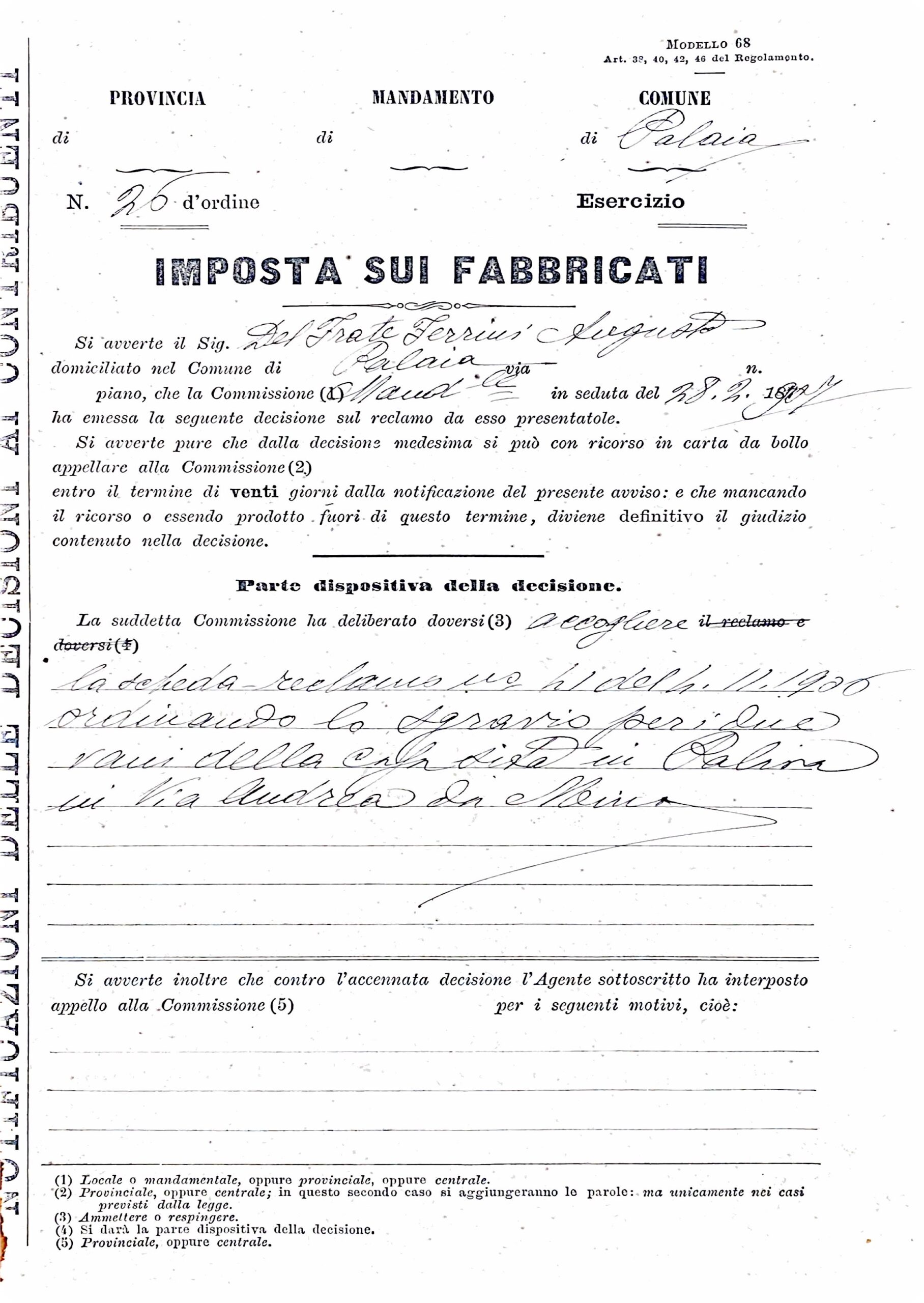 Possiamo ipotizzare diverse ragioni: danni subiti dagli immobili a causa di eventi atmosferici, difficoltà economiche legate a cattivi raccolti, o forse una valutazione fiscale ritenuta eccessiva e non corrispondente al reale valore dei fabbricati. Qualunque sia la ragione, è evidente che Del Frate Ferrini non si rassegnava passivamente alla tassazione, ma cercava attivamente di far valere le proprie ragioni.
