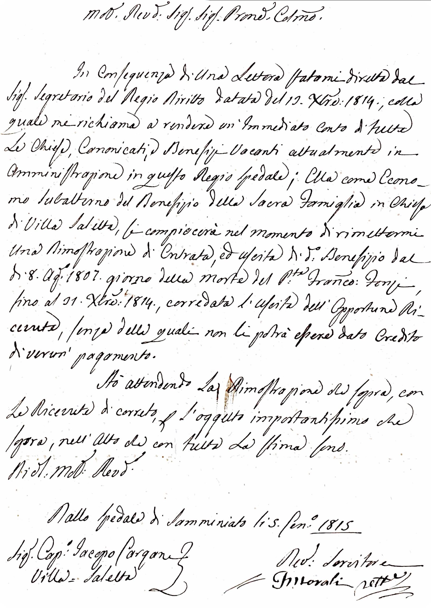 Al centro della scena troviamo il Sig. Jacopo Gargani, Economo Subalterno, investito della responsabilità di gestire il Benefizio della Sacra Famiglia. Un incarico non da poco, reso ancor più gravoso dalle disposizioni del Regio Diritto, che imponevano una rigorosa rendicontazione di ogni entrata e uscita.