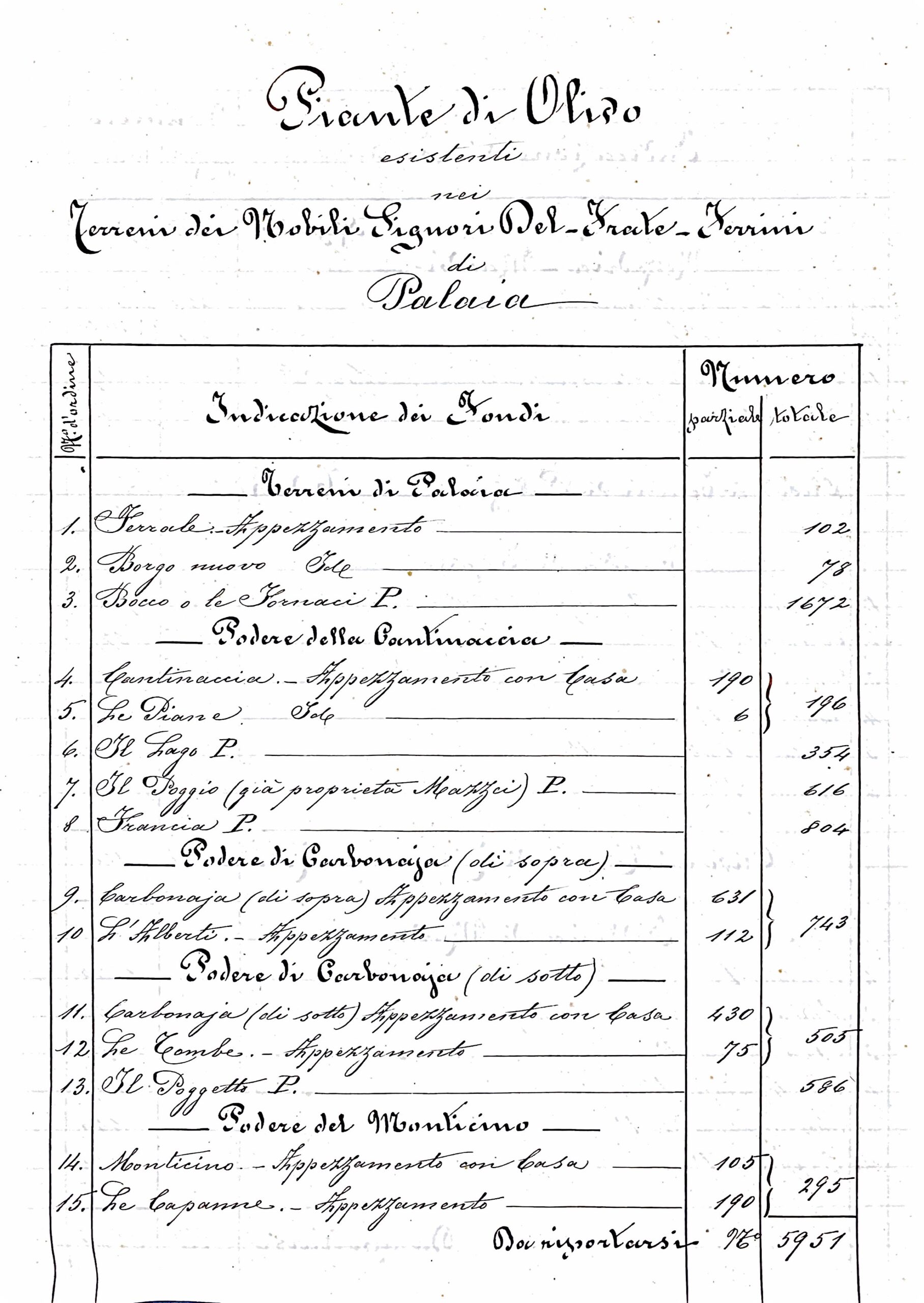 Sebbene le proprietà si estendessero su un territorio ampio, Palaia sembra emergere come il centro nevralgico dell’attività olivicola dei Del-Frate Ferrini. La cura e l’attenzione dedicate alla registrazione dei terreni e delle piante di olivo in questa località sottolineano l’importanza strategica che rivestiva per l’intera gestione del patrimonio.