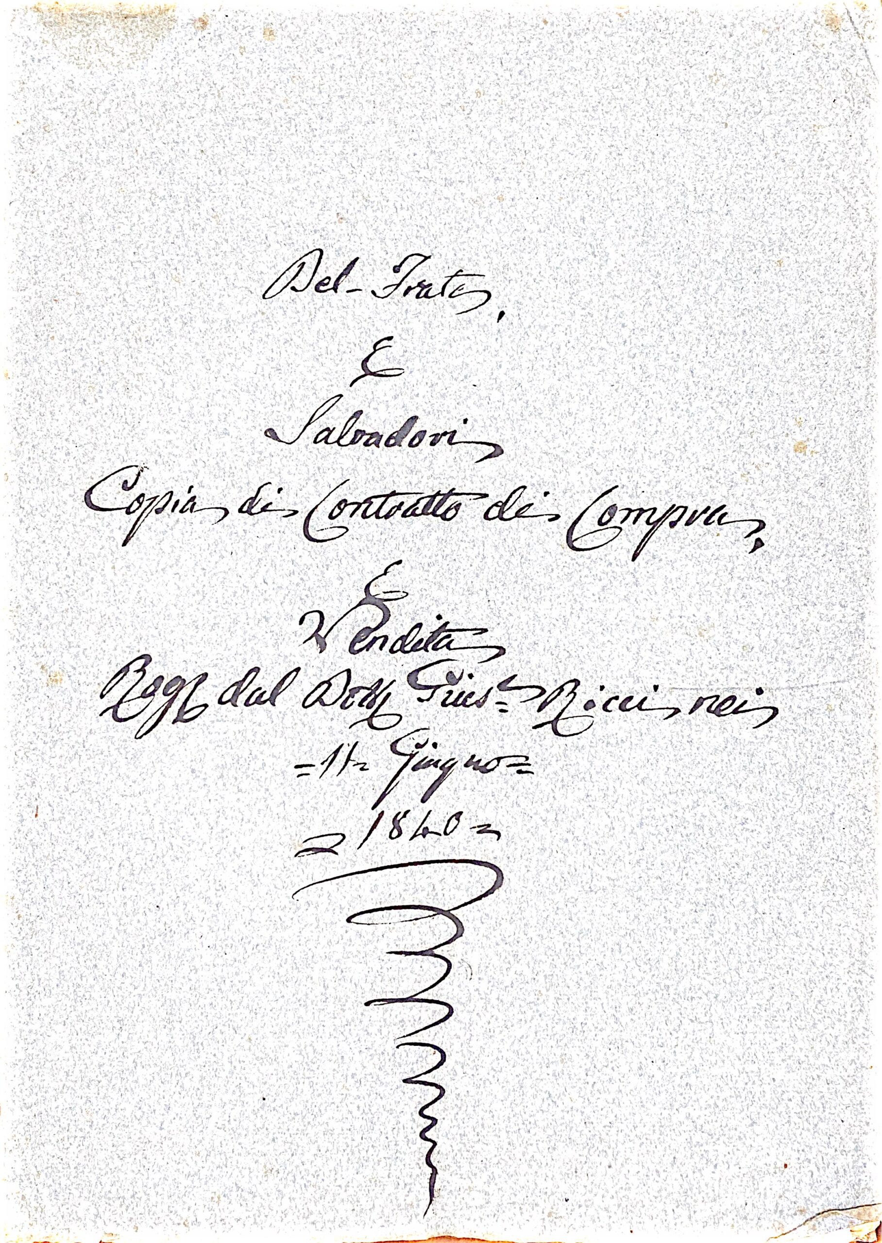 Il fascicolo analizzato contiene due atti distinti, entrambi datati 1840, che coinvolgono i membri della famiglia Del Frate. Il primo è un atto di compravendita, datato al 3 Maggio 1837, ma registrato nel 1840. Questa discrepanza temporale suggerisce che l’atto del 1840 sia una copia o un riferimento ad un contratto precedente, probabilmente necessario per successive operazioni.