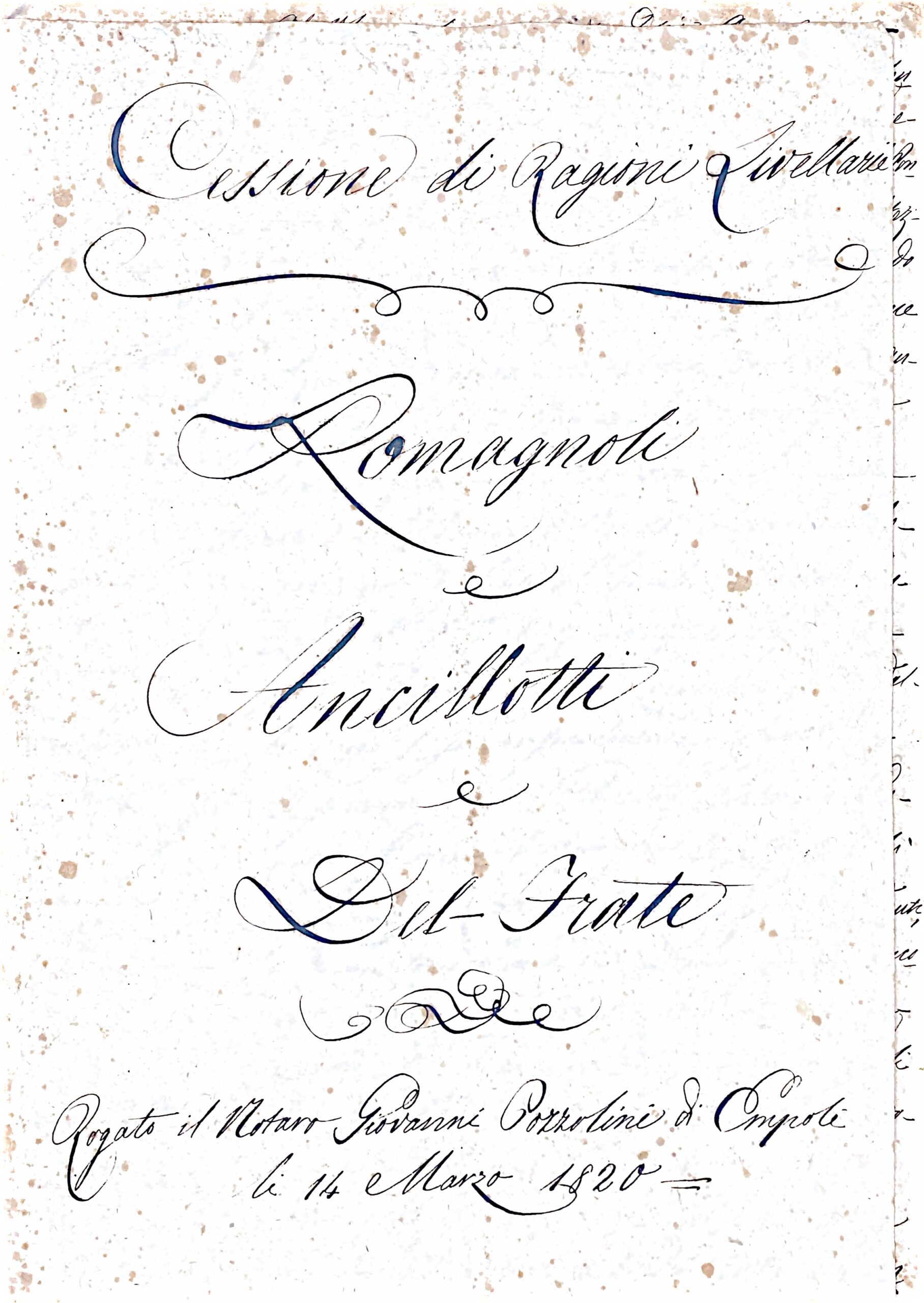L’atto notarile, vergato dal notaio Giovanni Pozzolini il 14 maggio 1820, ci presenta due nuclei familiari principali: gli Ancillotti e i Romagnoli. I primi, nelle figure dei fratelli Stefano, Marzio, Mariano e Pietro, agiscono in qualità di venditori. Sono eredi di Antonio Ancillotti, colui che originariamente aveva acquisito il livello, una forma di diritto reale limitato che concedeva l’uso del bene dietro pagamento di un canone.