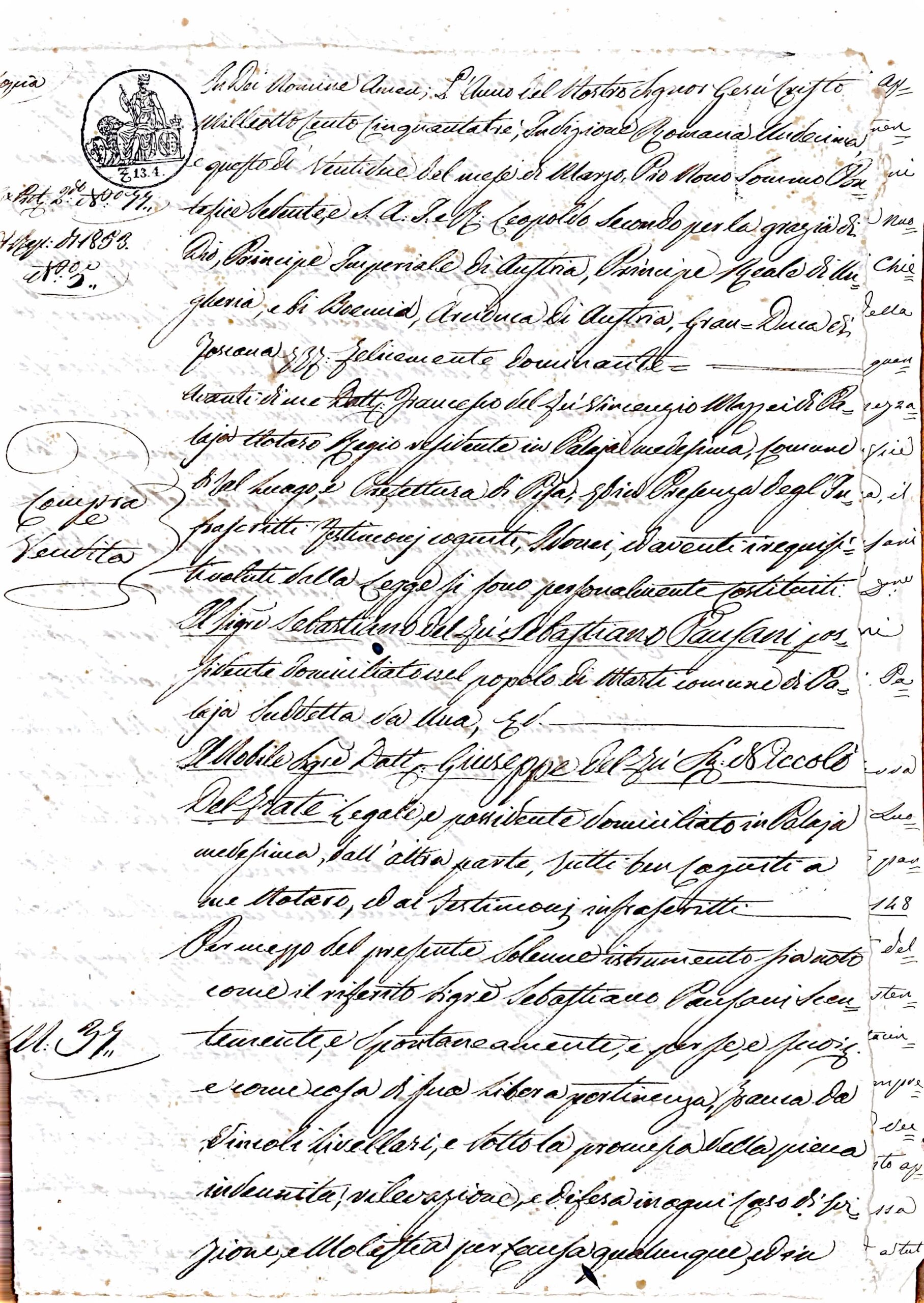 Oggi ci immergiamo negli archivi per svelare un piccolo, ma significativo, frammento di vita quotidiana nella Toscana del Granduca Leopoldo II. Un fascicolo notarile, datato 1853, ci racconta di un affare di terra avvenuto nel cuore della Valdera, precisamente a Palaia.