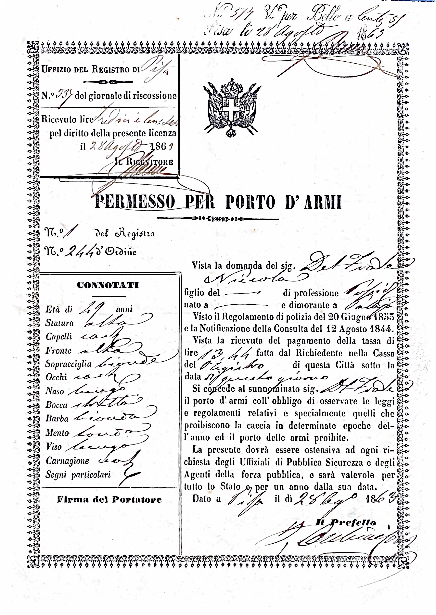 I documenti raccolti nel fascicolo – licenze e ricevute provenienti dalla Prefettura di Pisa – tracciano un quadro vivido della sua vita. Residente a Palaia, un borgo collinare della provincia pisana, Del Frate ottiene regolarmente i permessi necessari per il porto d’armi e per l’esercizio della caccia. Il più antico documento, datato 28 agosto 1863, è particolarmente interessante perché descrive fisicamente Del Frate e lo vincola al rispetto delle leggi in materia di armi. Immaginiamo, quindi, un uomo di una certa età, con caratteristiche fisiche distintive, che si attiene scrupolosamente alle normative vigenti per poter praticare la sua passione.