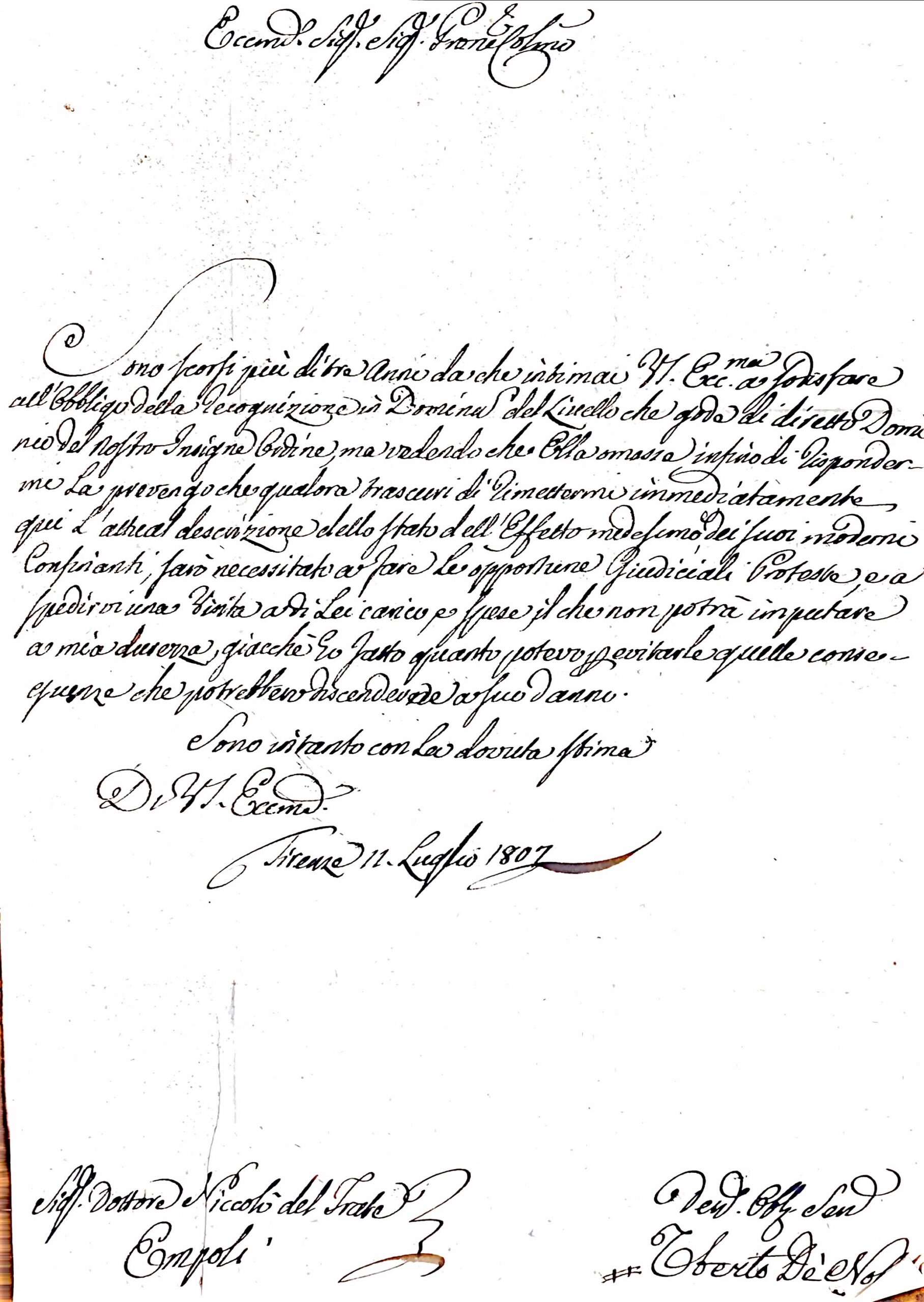 Il protagonista di questa storia è Uberto De Nofri, invischiato in una serie di debiti con Antonio Maestrelli. La documentazione, a partire da una comunicazione datata 11 luglio 1807, rivela una complessa rete di transazioni e obblighi finanziari. Le lettere e gli atti inclusi nel fascicolo testimoniano le pressioni legali esercitate su De Nofri per la ricognizione dello stato dei suoi terreni e per l’adempimento delle sue responsabilità finanziarie.