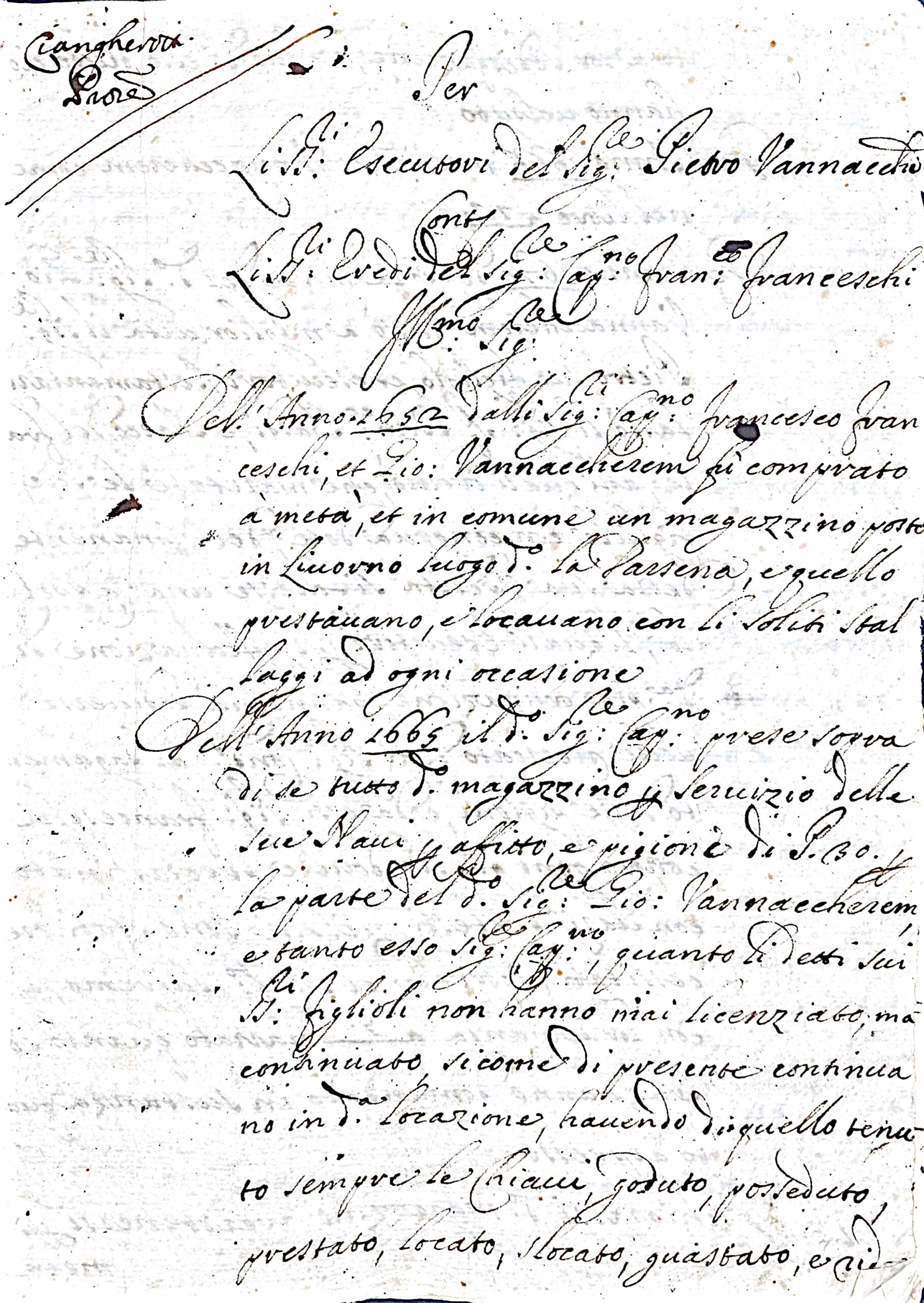 Al centro della contesa un magazzino a Livorno, città portuale in rapida espansione e fulcro del commercio toscano. Acquistato nel 1652, il magazzino divenne ben presto pomo della discordia. Il Capitano Francesco Franceschi, a quanto pare, continuò ad utilizzare e gestire la struttura dopo l’acquisto, senza però corrispondere le pigioni dovute agli eredi di Vannaccherem. Un’omissione, o forse un’interpretazione differente degli accordi, che innescò una spirale di atti legali, rivendicazioni patrimoniali e testimonianze.