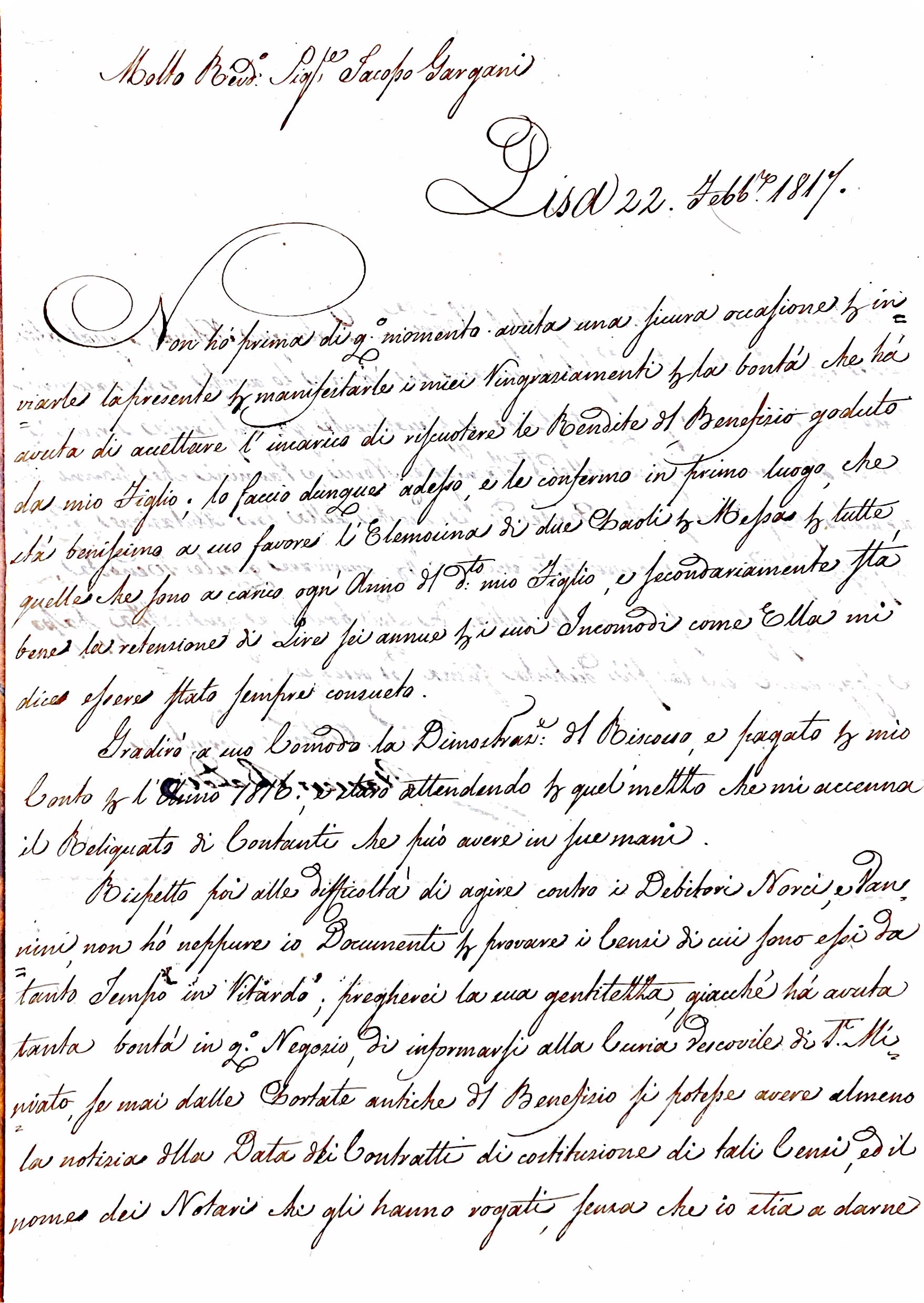 La lettera riguarda la riscossione di rendite derivanti da un Benefizio ecclesiastico. Sappiamo che i Benefizi erano delle proprietà ecclesiastiche che garantivano un reddito al titolare, solitamente un sacerdote, in cambio dell’adempimento di determinati doveri religiosi, come la celebrazione di messe. La lettera menziona anche i pagamenti di messe, suggerendo che il sacerdote in questione si occupava attivamente di amministrare e incassare quanto gli spettava per le sue funzioni.