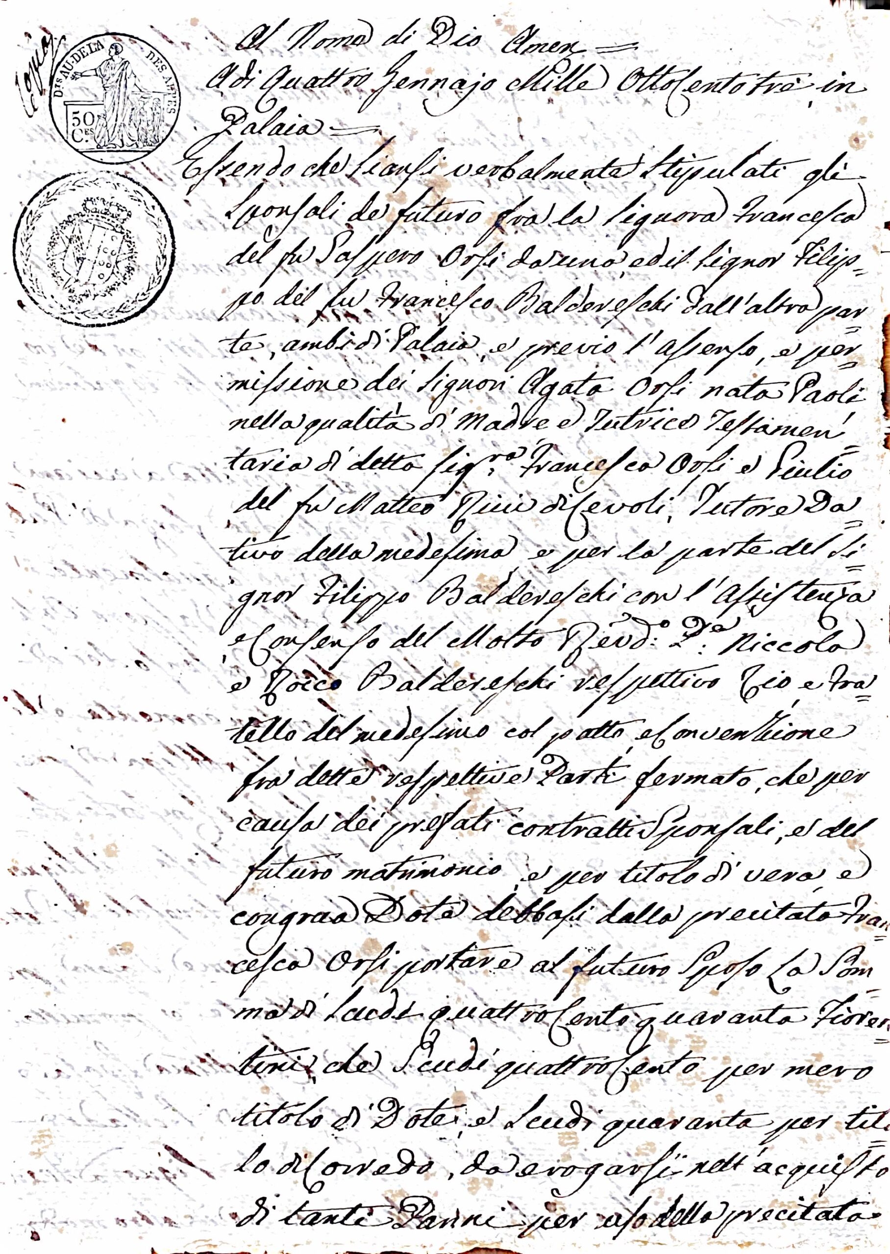 L’atto, datato 4 gennaio 1803 e stipulato a Palaia, rappresenta un accordo prematrimoniale tra Francesca Orsi e Filippo Baldereschi. In un’epoca in cui il matrimonio era spesso un affare di famiglia, più che una scelta individuale, il contratto definiva con precisione gli impegni finanziari e personali tra i futuri sposi e, soprattutto, tra i loro tutori.