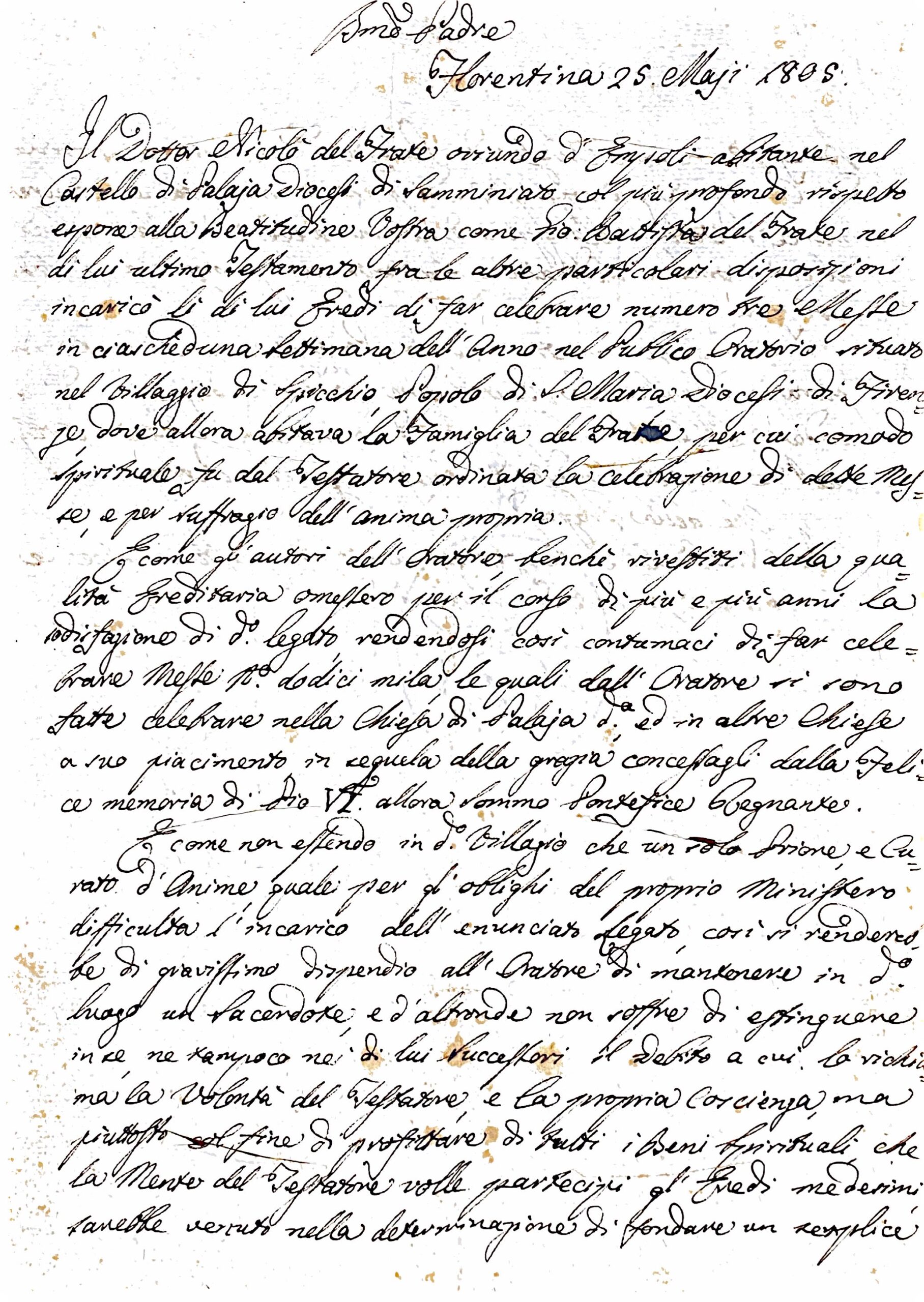 Oggi apriamo un affascinante fascicolo d’archivio che ci trasporta nel cuore del Regno d’Etruria, agli albori del XIX secolo. Un periodo di grandi sconvolgimenti politici e sociali, ma anche di profonde radici nella tradizione e nella fede. Il documento, proveniente dagli archivi fiorentini, riguarda l’eredità di Giovanni Battista del Frate e, in particolare, una disputa sulla traslazione di un obbligo testamentario: la celebrazione di Messe per la sua anima.